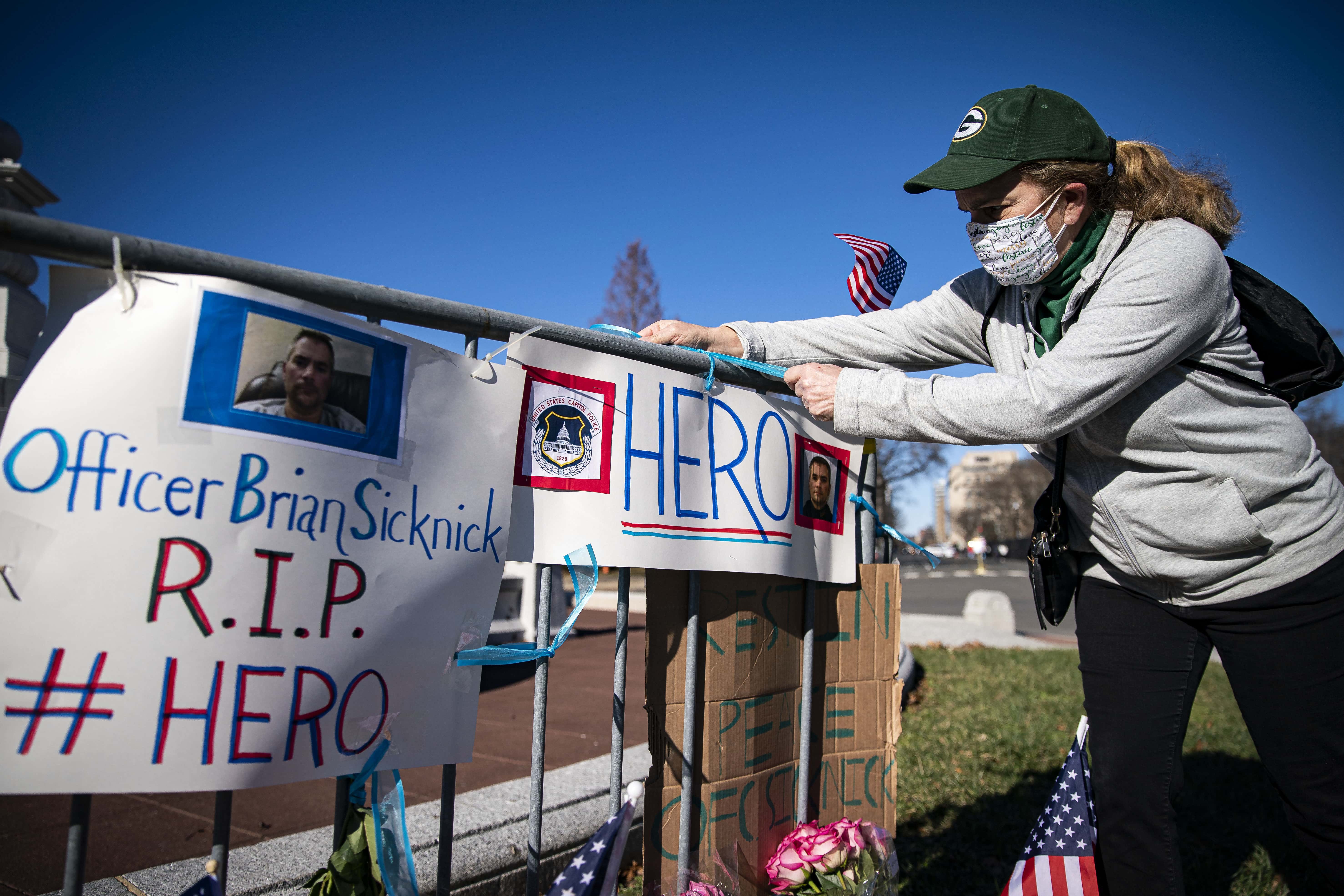 Anne Seymour, a crime victim advocate, creates a makeshift memorial for U.S. Capitol Police Officer Brian Sicknick, who was fatally injured when a pro-Trump mob stormed and entered the Capitol Building on Wednesday, near the West Front of the U.S. Capitol on January 9, 2021 in Washington, DC. A pro-Trump mob stormed and desecrated the U.S. Capitol on January 6 as Congress held a joint session to ratify President-elect Joe Biden’s 306-232 Electoral College win over President Donald Trump. (Getty Images)