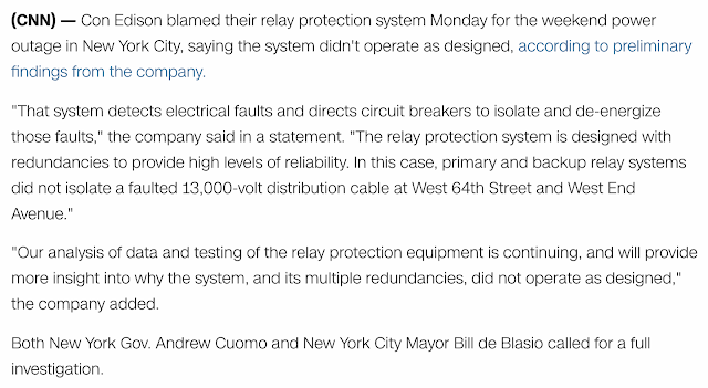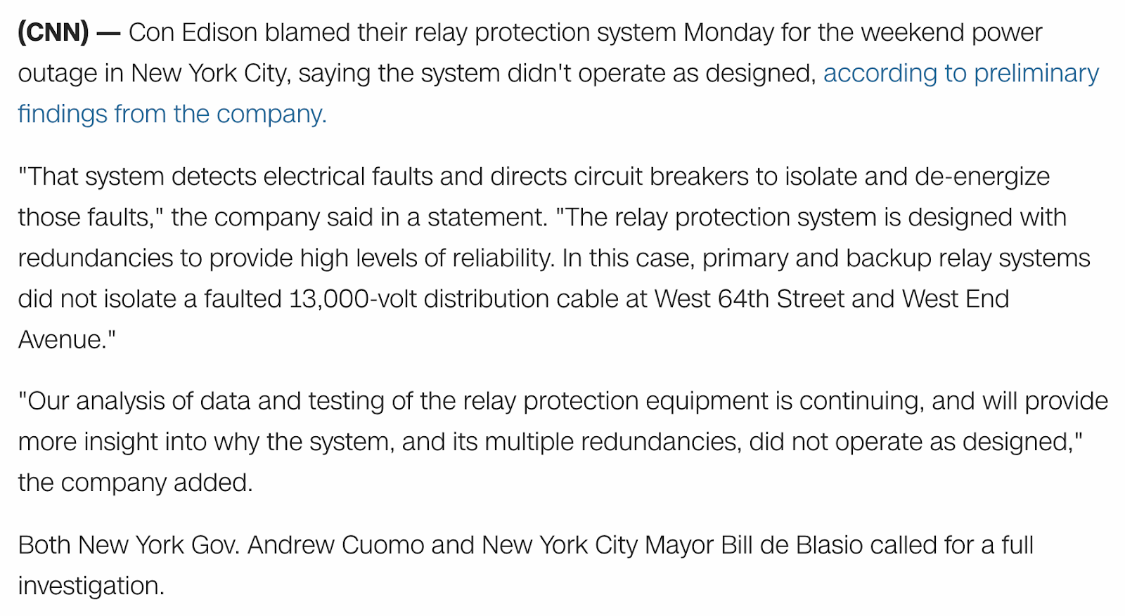 Now New York’s top lawmakers are calling for probes of the utility company. U.S. Senator Chuck Schumer, a Democrat, called it “entirely preventable” and said the U.S. Energy Department should work with city and state officials to investigate. Governor Andrew Cuomo and New York City Mayor Bill de Blasio have also demanded an explanation for why 73,000 customers lost power.  And the disclosure of a faulty relay system on Monday is raising even more questions.